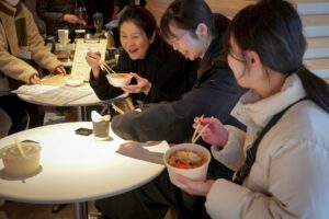 屋外出店の店舗からテイクアウトした牛丼を食べる人たちの笑い声がこだまし、